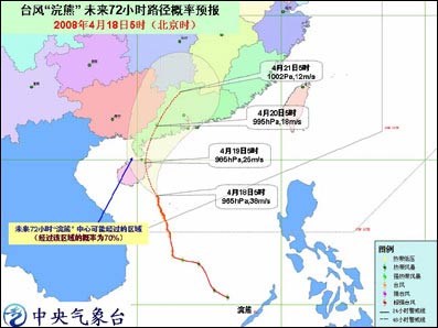 中新網(wǎng)4月18日電 據(jù)問天網(wǎng)消息,中央氣象臺今天早晨六點鐘發(fā)布臺風(fēng)橙色緊急警報:今年第1號臺風(fēng)浣熊(NEOGURI)的中心今天早晨5點鐘位于海南省萬寧市東南偏南方向大約180公里的南海中部海面上,就是北緯17.5度,東經(jīng)111.4 度,中心附近最大風(fēng)力有13級(38米/秒)。