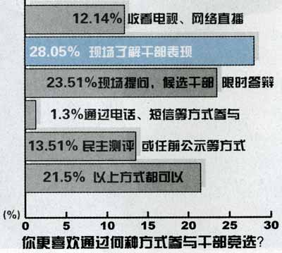 “如果條件許可,你更喜歡通過何種方式了解和參與干部競選?”調(diào)查結(jié)果顯示,“到演講答辯現(xiàn)場,全面了解干部現(xiàn)場反應(yīng)”、“現(xiàn)場提問,并要求候選干部限時答辯”排在了前兩位,占受調(diào)查者的51.56%。此后是“任前公示或民主測評等方式”和“收看電視、網(wǎng)絡(luò)直播”,最不愿意采用的方式是電話或短信方式。也有部分受調(diào)查者表示以上形式都可以。記者隨機采訪的部分市民紛紛表示:“如果條件許可,我們愿意到現(xiàn)場。”