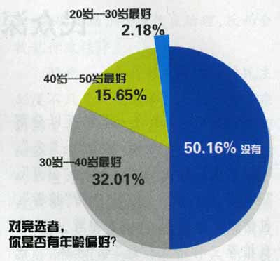 年齡偏好。就年齡而言。50.16%的受調(diào)查者表示對受調(diào)查者沒有年齡偏好。但在對競選者進行年齡段劃分,20歲至50歲每十歲為一個年齡段時,顯示出相對而言群眾更加看好30到40歲的參選者。“山東驚現(xiàn)‘80后’廳官!”“史上最牛公務(wù)員!”近日,共青團山東省委副書記,現(xiàn)年28歲的張輝成了網(wǎng)絡(luò)紅人,引起社會廣泛關(guān)注。實際上,如果單就年齡而言,這并非稀罕事。河北省代省長胡春華是中國最年輕的省長,其仕途路上一直都是最年輕干部,27歲任副廳,29歲當正廳。據(jù)相關(guān)披露,若非因太年輕,24歲就是副廳。 (執(zhí)筆:人民論壇記者 艾 蕓)