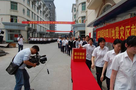 這3000條“愛心被”是公司與客戶協商,騰出部分被子,并動員廣大員工連夜加班趕制的;這3000條“愛心被”集結著盛宇每一位員工與廣大客戶的愛心,價值100萬元。在曾上教總裁的帶領下,盛宇集團總部、盛宇集團湖北嘉魚染織有限公司、盛宇集團湖北赤壁華盛紡織有限公司全體員工排成 “長龍”,依次向募捐箱中投入愛心款,與災區人民共渡難關。