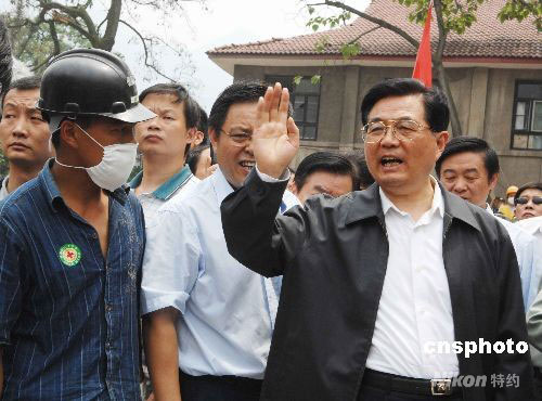中共中央總書記、國家主席、中央軍委主席胡錦濤五月十六日抵達(dá)地震重災(zāi)區(qū)綿陽北川查看災(zāi)情,并慰問參加搶險(xiǎn)救災(zāi)部隊(duì)指戰(zhàn)員和受災(zāi)群眾。中新社發(fā) 陳文 攝