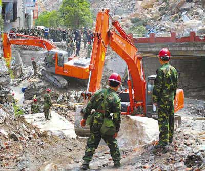 5月15日,記者看到,中國人民解放軍第二炮兵及北京路橋、四川路橋和華西集團的挖掘機、推土機等重型施工機械經過長途開進,突入北川,立即投入,晝夜不停。四臺挖掘機在探照燈照射下,緊張施工,機械手輪流操作,機器徹夜不停轉。