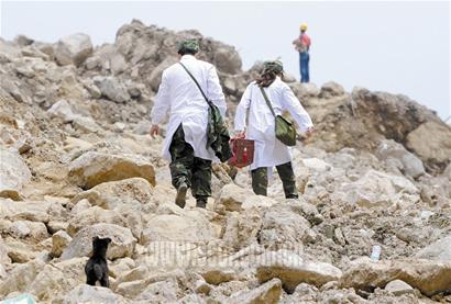 已成廢墟的謝家寨是記者昨日最難通過的路段之一,數百米坑洼滾動的巨石上,只有一條僅容一人通過的道路,頭頂還不時傳來山石滾落的聲音,攀爬甚至連滾帶爬是通過的惟一方式。“讓一讓!”上午11點55分,對面突然出現一隊抬著擔架的戰士,一個73歲的婆婆像寶貝一樣被小心舉過了“惡魔巖”般的謝家寨斷山。“穩住、小心……”十余個戰士有的站上巨石小心提著擔架,有的則退下崖邊費力地上舉著,還有數個醫護隊員在前后開路。“婆婆,挺住。”記者對她說,在廢墟里堅持了近百個小時的老人睜開了眼睛,一滴眼淚滾出眼角。據悉,老人姓王,由于腿上有風濕,發生地震時不能逃生致使被困,好在身邊有水有食。在戰士們搜救到她家時,王婆婆用拐杖敲擊磚塊,這個73歲的老人在被困90小時后奇跡般獲救。