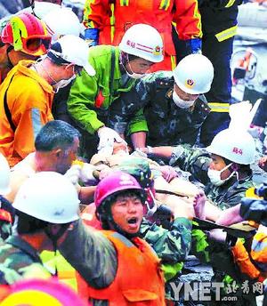 6點10分,手已經(jīng)伸了出來,肩膀還卡著。消防隊員找了一塊門板,做好了最后的準(zhǔn)備。由于是五層樓坍塌,層層疊加在上面,都是水泥板,后面有木板,只能掏一個洞慢慢掏進(jìn)去。但是到下午,卞剛芬生命體征開始變得衰弱,消防人員用一根管子,不斷給她喂水和牛奶,并不時和她聊天給她鼓勵。下午6點15分,在一片歡呼聲中,卞剛芬被成功救出。現(xiàn)場的醫(yī)療人員迅速對其進(jìn)行身體特征的檢查并對其輸液。現(xiàn)場響起一片掌聲。(馬輝 周春林)