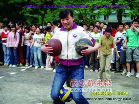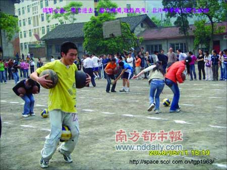 博客照片里在操場上歡笑的學生們,都是高三的孩子。地震前一天,高三年級搞了一個類似趣味運動會的活動。唐老師說,高三的學生很久沒有這樣歡暢地玩過了,他們一直在為迎接高考而奮戰。那天距離高考只剩下了26天。北川中學是綿陽市的示范學校,每年的高考成績是北川的驕傲。