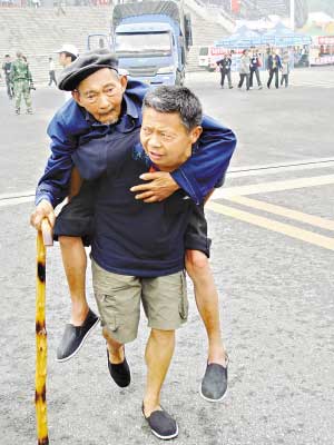 50歲的金光銀背著82歲的老父親金云才也來排隊。老人身體不好,腿腳不便,只有讓兒子背著走路。金光銀說:“政府都給我們安排好了,我們要轉(zhuǎn)移了。”