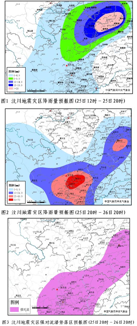 25日夜間至26日白天,四川、甘肅南部、陜西南部等地震災(zāi)區(qū)將出現(xiàn)一次中到大雨、局地暴雨天氣,并伴有短時雷雨大風等強對流天氣。四川北川(包括堰塞湖地區(qū))、理縣、汶川、都江堰、茂縣、綿竹的降雨量為20-60毫米,青川、廣元的降雨量為8-20毫米,甘肅文縣、陜西寧強和略陽的降雨量為3-10毫米,上述地區(qū)伴有短時雷雨大風天氣,請注意采取帳篷的防風防雷措施。