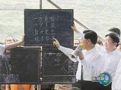 胡錦濤還拿起粉筆在小黑板上寫(xiě)下十六個(gè)大字,“一方有難、八方支援、自力更生、艱苦奮斗”,寫(xiě)完,胡錦濤領(lǐng)著孩子們一起大聲朗誦。
