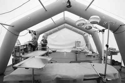 醫(yī)院設(shè)立了門診、內(nèi)科、外科、婦科、兒科和藥房,還有放射科、檢驗(yàn)科、病房以及重癥監(jiān)護(hù)室,可謂“麻雀雖小,五臟俱全”。我們來到作為手術(shù)室的帳篷前,這頂帳篷不僅大而且顯得安全、結(jié)實(shí),帳篷用充氣管支撐起來,里面有散熱的空調(diào)設(shè)備。據(jù)介紹,野戰(zhàn)醫(yī)院每頂帳篷都由天然材料制成,防火、無污染,還有真空隔熱層。配備的制氧機(jī)可直接將空氣變成氧氣,并可以調(diào)節(jié)氧氣濃度,從而代替了笨重的氧氣瓶。帳篷里面,整齊的擺放著手術(shù)服和拖鞋,一個(gè)洗手池已經(jīng)固定好。27日,這里就做了一臺簡單的手術(shù)。