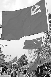 飄揚的紅旗在災區隨處可見(張雷/攝)