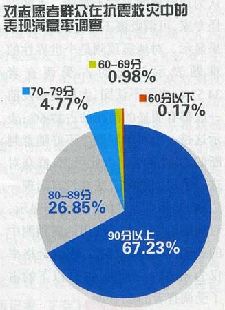 數(shù)據(jù)顯示,對(duì)志愿者在抗震救災(zāi)中的表現(xiàn),67.23%的受調(diào)查者給出了90分以上的高分,給80分以上的則占到了94.08%,滿意率達(dá)到了98.85%。NGO組織和志愿者群體是此次抗震救災(zāi)中的一支特別突出的力量,社會(huì)、新聞媒體無(wú)不為他們的出現(xiàn)和廣泛參與歡欣鼓舞,并喻其為公民社會(huì)發(fā)育的有力證明。從雪災(zāi)到3·14藏獨(dú)事件,再到汶川大地震,中華民族可謂空前團(tuán)結(jié),愛(ài)國(guó)熱情一浪高過(guò)一浪,在這一浪又一浪的愛(ài)國(guó)熱情面前,年輕人受到了洗禮,“80后”、“90后”得到了很好的鍛煉,表現(xiàn)讓世人側(cè)目。在志愿者隊(duì)伍里,活躍著為數(shù)不少的“80后”、“90后”,綠絲帶等志愿行動(dòng)多數(shù)就是由他們發(fā)起。唐山志愿者、山東農(nóng)民工志愿者等等都給人們留下了深刻的印象。
