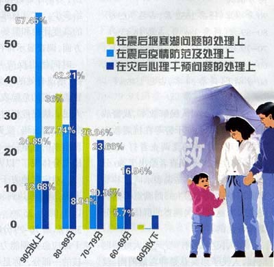 數(shù)據(jù)表明,對(duì)黨和政府在抗震救災(zāi)中的表現(xiàn),滿意率達(dá)到94.81%。其中,對(duì)黨和國(guó)家領(lǐng)導(dǎo)人在抗震救災(zāi)中的表現(xiàn),受調(diào)查者普遍表示了高度贊揚(yáng),90%的受訪者表示滿分是多少就給多少。這就意味著群眾對(duì)黨和政府的高度評(píng)價(jià)和贊揚(yáng)。其中得分最高的方面,調(diào)查顯示排在前四位的是:在第一時(shí)間做出反應(yīng)并趕赴抗震救災(zāi)前線、迅速有效的應(yīng)急反應(yīng)和指揮部署、冒著余震的危險(xiǎn)夜以繼日地安撫災(zāi)區(qū)人民、情況危機(jī)時(shí)刻和看望災(zāi)區(qū)人民時(shí)的動(dòng)情言語(yǔ)。受調(diào)查者表示,政府表現(xiàn)出來(lái)的尊重每一個(gè)平民的生命的舉措充分體現(xiàn)了“以人為本”的理念。