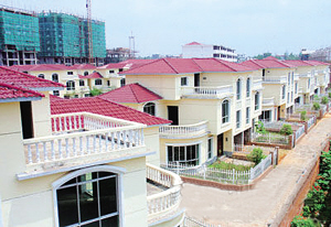 在景德鎮(zhèn)市西山路口附近,幾排別墅,鱗次櫛比,掩映在樹叢和民房之中。別墅均為紅瓦黃墻的三層小樓,房前都帶單獨小院和車庫。7月22日上午,記者來到這里時,小區(qū)入口的大門已經被緊緊鎖住。由于還沒有人入住,這里顯得格外安靜。