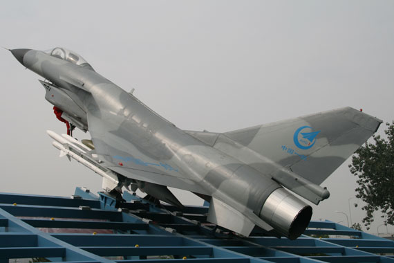 中國自主研制殲十戰機。圖為一航大廈前的殲十全比例模型。