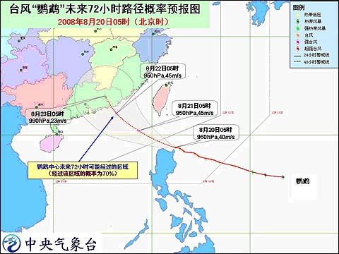 受其影響,今天白天到夜間,巴士海峽、巴林塘海峽、臺灣省南部沿海、臺灣東南部海面、南海東北部海面將有到7-10級大風,“鸚鵡”中心經過的附近海面風力可達11-14級;臺灣南部的部分地區將有大到暴雨。