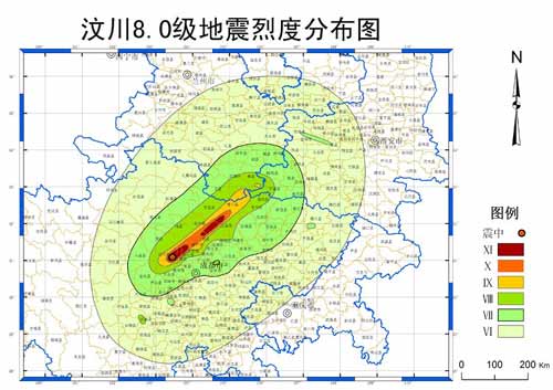 Ⅺ度區:面積約2419平方公里,以四川省汶川縣映秀鎮和北川縣縣城為兩個中心呈長條狀分布,其中映秀Ⅺ度區沿汶川-都江堰-彭州方向分布,長軸約66公里,短軸約20公里,北川Ⅺ度區沿安縣-北川-平武方向分布,長軸約82公里,短軸約15公里。