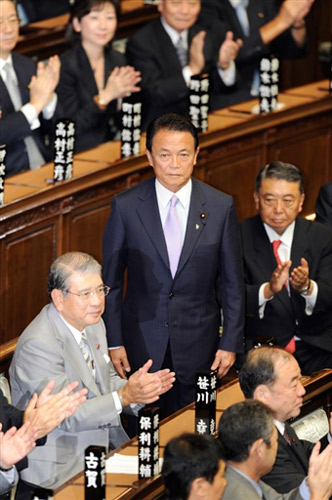 24日當(dāng)?shù)貢r(shí)間13點(diǎn)30分,兩天前剛剛當(dāng)選自民黨總裁的麻生太郎在眾議院全體會議上以337票被指定為第92任日本總理大臣。參議院隨即將召開全體會議進(jìn)行首相提名選舉,預(yù)計(jì)民主黨黨首小澤一郎將當(dāng)選。