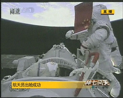 16時39分許,身著中國自行研制的第一套艙外航天服——“飛天”艙外航天服的航天員翟志剛順利出艙,開始實施中國首次空間出艙活動。