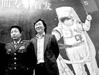 發(fā)布會(huì)上首次公布了隨“神七”飛船飛天的100多首歌曲,其中包括全新創(chuàng)作的15首航天歌曲專(zhuān)輯。楊利偉表示,“我深?lèi)?ài)《我為祖國(guó)感到驕傲》這首歌,每一次聽(tīng)到都會(huì)感到心情激動(dòng)。那就是我們航天員回到地球打開(kāi)艙門(mén)時(shí)最想說(shuō)的第一句話(huà),是我們的真情感受。”本臺(tái)晚會(huì)的音樂(lè)總監(jiān)、蒙族音樂(lè)家恩克巴雅爾也是 《我為祖國(guó)感到驕傲》的曲作者,他介紹說(shuō):“這一百多首歌曲有郭蘭英演唱的《我的祖國(guó)》、宋祖英演唱的《望月》以及成龍演唱的《男兒當(dāng)自強(qiáng)》等。”(記者 李澄/文 鄒紅/攝)