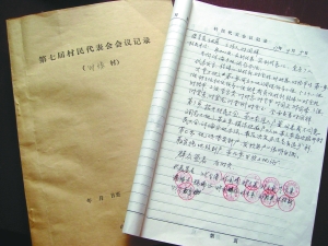 10月17日,時國祥帶著記者走進(jìn)時家樓村村委會二樓辦公室,他從抽屜里拿出2007年村民代表會議記錄本,里面的每一頁上都能看見成片的小圓章,這些圓章就是村民代表們的“表決器”。