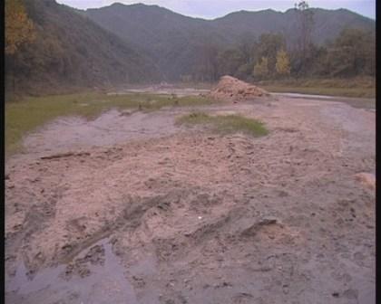 解說:記者來到現場,果然看到一片因尾礦庫泄露的莊稼地.。上面覆蓋著厚厚的礦渣.就在記者正在拍攝時,巨恒公司二廠的人員趕來,阻止了記者的繼續拍攝。見此情況記者離開了巨恒公司二廠。沿河道向上繼續了解情況。