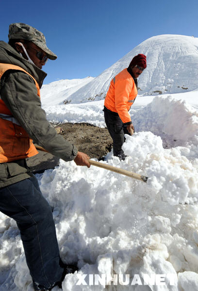 10月30日,西藏錯那縣養護段三工區的養路工人在清理公路積雪。新華社記者賈立君攝