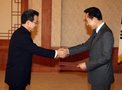 隨后程大使到接見廳向李明博總統(tǒng)遞交國書。韓外交部長(zhǎng)官柳明桓、總統(tǒng)外交安保首席秘書金星煥和中國駐韓國大使館公參邢海明、陳洲等參加了儀式。