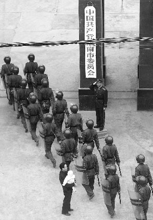 8時左右,市委大門口又陸續聚集人員。10時30分左右,約有1000多人沖進市委后院,手持鐵锨、棍棒、磚頭、石塊等攻擊公安民警和武警,砸毀3輛小車。