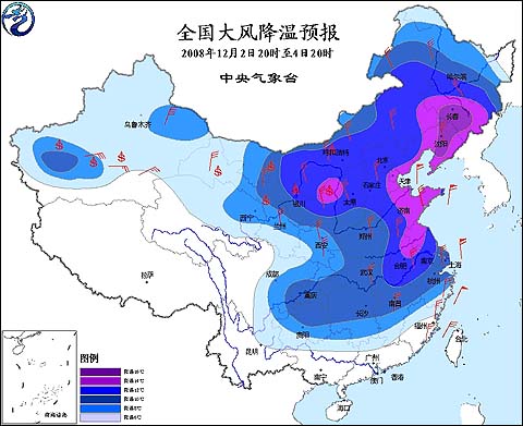 中央氣象臺(tái)2008年12月2日18時(shí)發(fā)布寒潮橙色警報(bào):