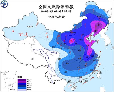 中央氣象臺2008年12月3日06時繼續發布寒潮橙色警報: