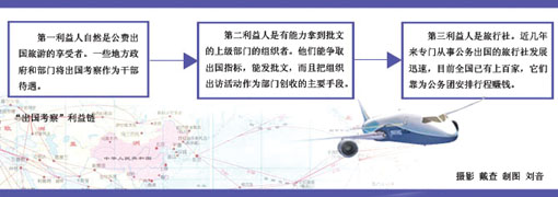第三利益人自然就是旅行社。據了解,近幾年來專門從事公務出國的旅行社發展迅速,目前全國已有上百家,集中在廣州、上海、北京、南京、寧波等地。它們靠為公務團安排行程賺錢。“現在各級各地組織的出境、出國考察活動,絕大部分是通過旅游公司出去、并由境外旅游機構接團安排行程的,其實就是公款旅游。”新余市委一位干部對記者說。