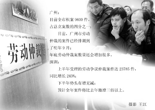 記者了解到,深圳市勞動爭議仲裁院同樣面臨著勞動仲裁案件“井噴”的問題。該院負責人告訴記者,上半年他們受理的仲裁案件達到了23785宗,同比增長了243%,下半年勢頭有增無減,預計全年的案件將比去年激增三倍以上。