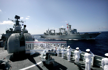 在遠(yuǎn)洋部署方面,目前,中國海軍已經(jīng)具備海上艦艇編隊“縱向”、“雙橫向”以及直升機(jī)垂直方向的補給能力,滿載排水量達(dá)到3萬噸的“微山湖”號大型遠(yuǎn)洋綜合補給艦將為編隊提供堅實的后勤支持。2007年8月,海軍出訪歐洲艦艇編隊曾在印度洋上成功進(jìn)行了航行中綜合補給。在3個多小時的航行補給中,“微山湖”號(887艦)順利為168艦補給了燃油、淡水和蔬菜食品,為艦艇編隊穿越印度洋進(jìn)入紅海和地中海,完成遠(yuǎn)航出訪任務(wù)提供了有力保障。
