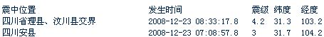 據地震臺網測定,北京時間2008-12-23 08:33:17.8 在四川省理縣、汶川縣交界(北緯31.3,東經103.2) 發生4.2級地震。成都市區震感明顯。