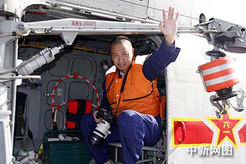 雖然直升機起飛尚有一段時間,但急性子的我還是檢查好相機等采訪拍攝裝備,穿上救生衣,早早地就跑到甲板上守侯著。艦上時間上午九點多,飛行員和乘機人員開始登機,中央人民廣播電臺記者孫利特地趕來,給我拍了一幅起飛前在直升機上揮手的照片。