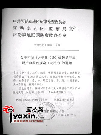 阿勒泰地區官員的財產申報制度,始于去年5月的一份《縣(處)級領導干部財產申報的規定(試行)》(下稱《規定》)。這份文件的起草人和主推者即吳偉平。