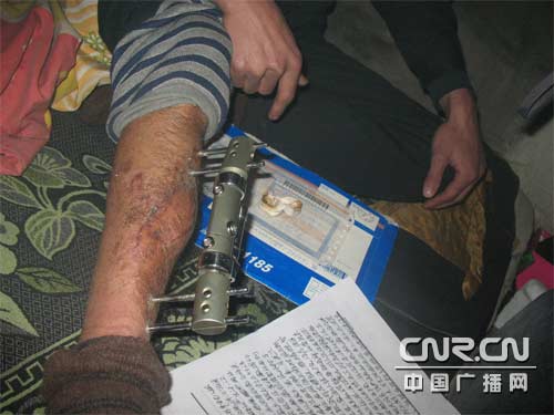 走進李權柱租來的不足10平米的小屋時,屋里彌漫著嗆人的煤煙,但屋里的水缸卻結了冰。李權柱和他的愛人蜷縮在炕頭,挽起薄薄的秋褲,記者看到,一個60公分長的鐵夾深深地嵌進李權柱的小小腿上,皮膚和鐵夾相連的地方還在往外流著膿水,李權柱就拿紙纏在鐵夾上。