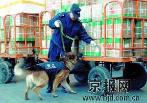 上午9時,4只“犬警官”坐鎮北京西站,在旅客行李房等處忙著緝毒搜爆,還將在廣場、站臺、垃圾箱、行李房、下水道及各陰暗角落搜查可疑物品。