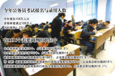 在7555個(gè)職位中,共有1196個(gè)職位沒有合格人選,或者合格人選未達(dá)到規(guī)定面試比例,其中有586個(gè)職位報(bào)考人數(shù)本身就未達(dá)到規(guī)定的面試比例,甚至無人報(bào)考。主管部門分析發(fā)現(xiàn),這些職位主要是艱苦、邊遠(yuǎn)、基層職位和專業(yè)特殊的職位,也有部分職位是由于設(shè)置不合理的資格條件,導(dǎo)致報(bào)考人員和過線人員較少。