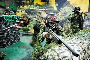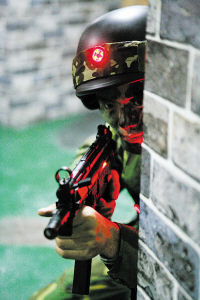 該團組建于1951年,參加過抗美援朝戰斗,是一支能征善戰的部隊。為提高訓練效益,該團借鑒CS網絡游戲模式,以城市巷戰為背景,通過點光、面光、導向照明及數碼成像相結合的燈光設計,使一個對抗系統能夠滿足黃昏、白晝、黑夜三種作戰環境需求。為最大限度接近實戰模擬,系統配備了激光仿真槍、頭盔、馬甲、仿真手雷、匕首等器材和用來記錄成績、設置子彈數量、游戲人員生命次數及對抗時間的控調設備,勝負成敗一目了然。為突出戰法運用,在場地設計上采用可移動實景戰術障礙物的設計,高板與矮墻結合、既設布景與就便器材并用,戰場環境可隨機調整,使每次對抗都能在一個全新的環境中進行。