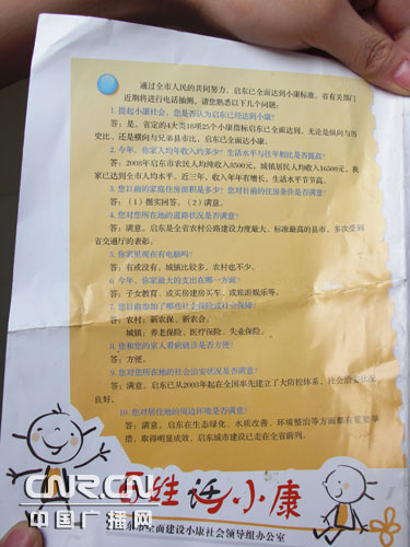 在多位村民家中,記者都看到了由啟東市全面建設小康社會領導小組辦公室印發的電話調查問卷。在這份印刷精美的問卷中共列有十個問題,并給出了標準答案。無論實際家庭人均年收入多少,農村居民必須回答8500元,城鎮居民必須回答16500元。無論是否參加社會保險或保障,都必須回答參加了;無論對住房、道路、居住環境是否滿意,都必須回答滿意。