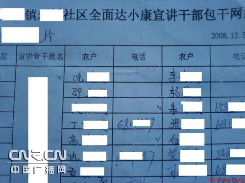 村民:調查前發下來的,大張旗鼓的發了這個紙條下來。開了幾次會了,說省里頭要電話抽查采訪,你們要按照發下來的東西回答,給你五十塊錢。采訪前的最后關鍵時刻,他們說提高到兩百元,還有144元的電話月租費。