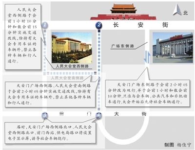 據介紹,在每次開會、散會前,天安門廣場西側路、人民大會堂南側路及人民大會堂西側路將分別采取交通管理措施,禁止各種車輛和行人通行。屆時,天安門廣場西側路北口、人民大會堂西側路北口、前門西站、供電局路口將設置電子顯示屏,誘導社會車輛繞行。