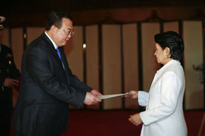 中新網3月12日電 據外交部網站消息,3月11日,中國新任駐菲律賓特命全權大使劉建超在菲律賓總統府向阿羅約總統遞交國書。菲律賓外交部長羅慕洛、總統府禮賓局局長桑托斯、中國駐菲律賓使館高級外交官等參加。