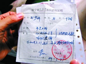 程傳勝,28歲,巨野縣章縫鎮(zhèn)程莊村人,他出具的女兒“診斷證明”上記載,程夢嬌被診斷為“手足口病、心力不全、呼吸衰竭”,于2009年3月17日死亡,“特作此證明。”這份證明上,蓋有濟寧市傳染病醫(yī)院門診部的紅色印章。