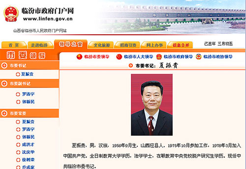 針對(duì)近日網(wǎng)上流傳的山西臨汾“自潰壩事故以來(lái)半年無(wú)人任市委書(shū)記”、“兩會(huì)”至今尚未召開(kāi)”的信息,編輯上午瀏覽了“臨汾市政府門(mén)戶網(wǎng)”發(fā)現(xiàn):臨汾市政府網(wǎng)站仍顯示夏振貴現(xiàn)任臨汾市委書(shū)記,羅清宇則現(xiàn)任中共臨汾市委副書(shū)記、代市長(zhǎng)。