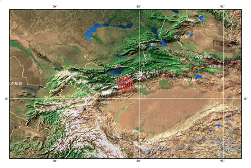 據(jù)測定,地震震中位于北緯四十一點三度, 東經(jīng)七十八點三度。