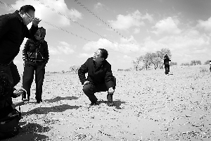 郭虎帶著氣象臺的年輕預報員,進入一處沙地。當時風很大,吹得大家睜不開眼睛,“瞬間風力能達到五六級。”不過,沒有沙塵。郭虎蹲下去,用手抓起一把沙子,一松手,沙子被吹出不遠就飄落了。“這說明沙子里的水分很多。”郭虎用手刨起沙子來,深不到1厘米的表層下,沙子都是濕的。