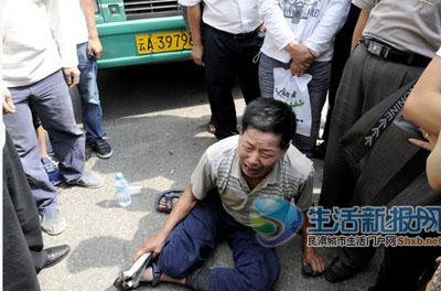一名50多歲的男子擋在一輛77路公交車前,坐在地上痛哭,民警怎么勸說他也不愿意離開。男子稱:“這些城管太不講道理了,他們快把我的兒子打死了。”據該男子介紹,20多名城管人員昨日早上將其兒子打傷,兒子被送進醫院搶救,而打人的城管全部跑了,“實在是沒有辦法,我兒子不能白白受罪,無奈之下,我只能通過這種方法引起相關部門的重視!
