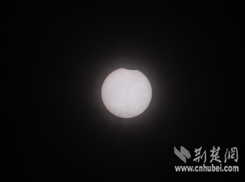 22日上午8時14分,日全食初虧在湖北武漢顯現(xiàn),圖為記者在湖北日報傳媒大廈拍攝的初虧奇觀。